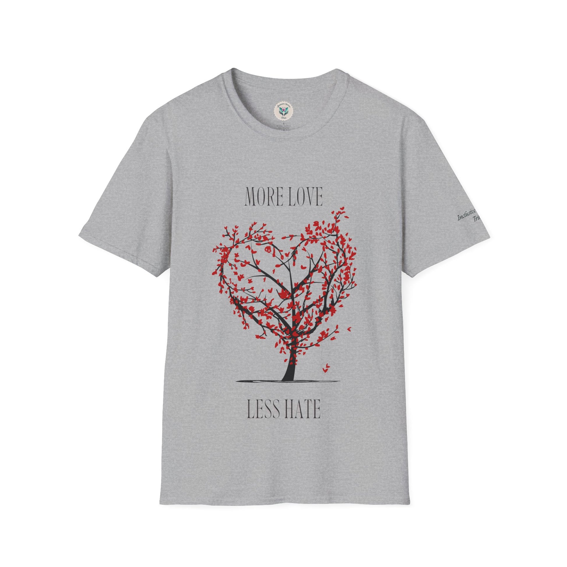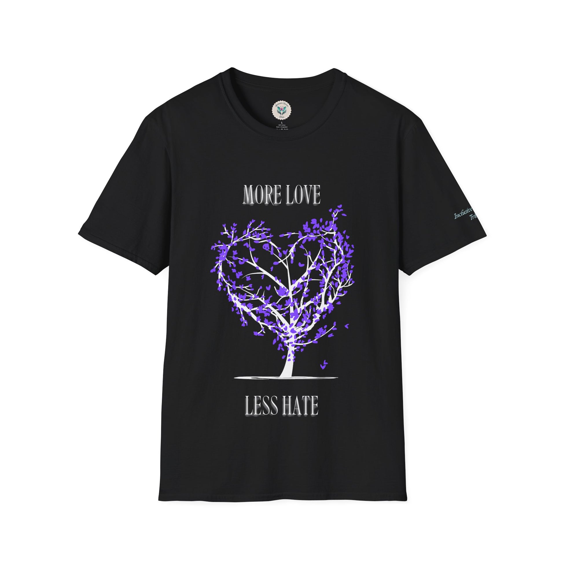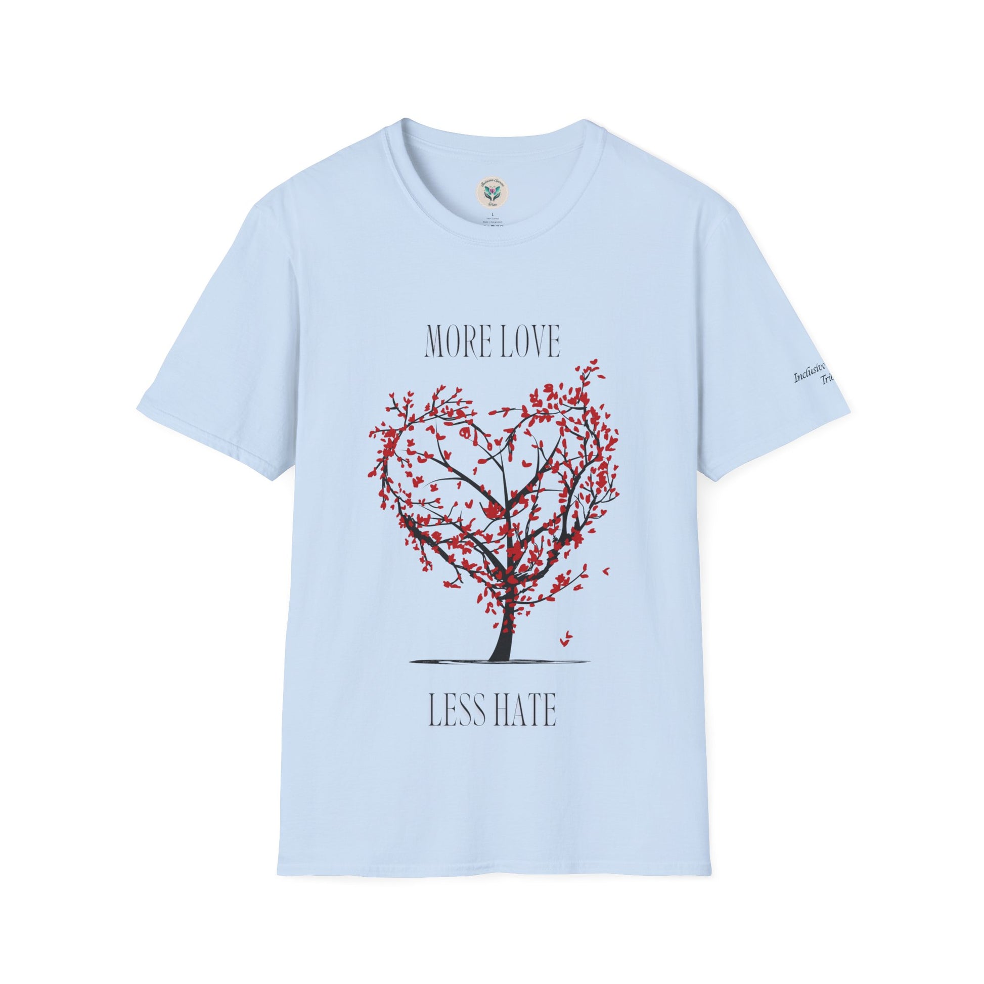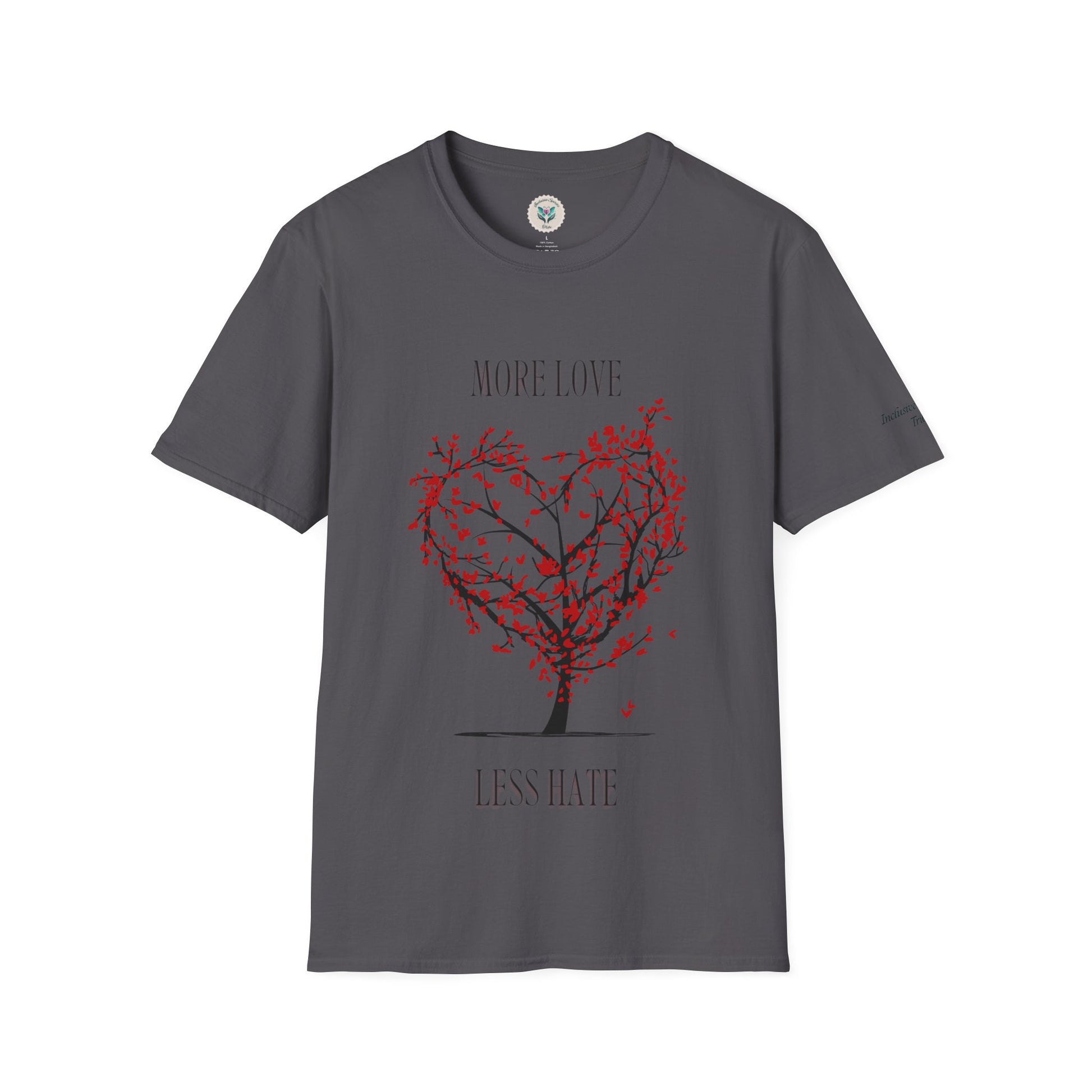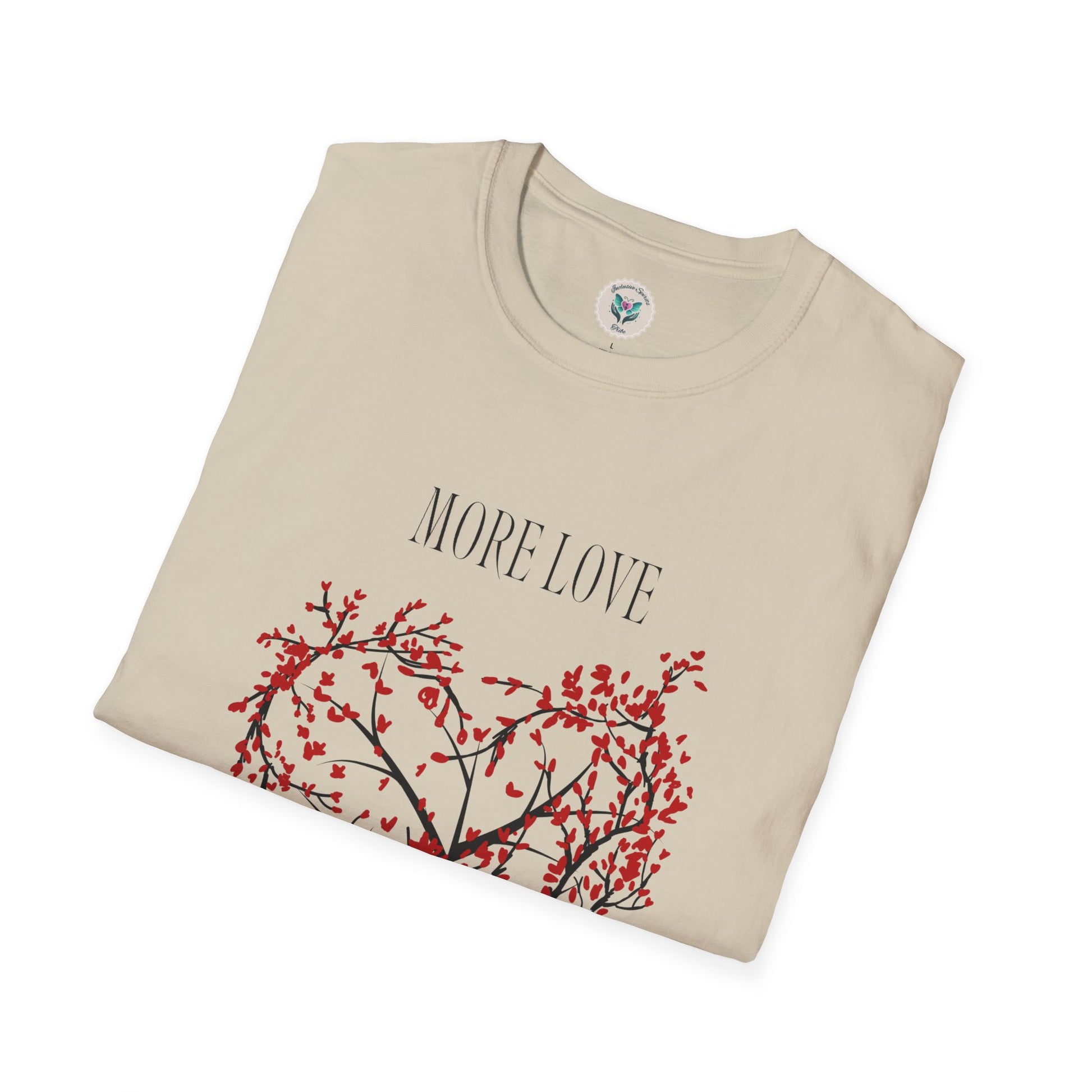 Discover this beautifully crafted Unisex Softstyle T-Shirt, featuring a heartwarming message of 'More Love, Less Hate,' that brings a peaceful vibe to your wardrobe. Ideal for casual outings, community events, or simply lounging at home, this t-shirt can easily be paired with jeans or joggers for effortless style. This product is perfect for environmentally conscious individuals who appreciate ethically sourced clothing. The lightweight fabric ensures year-round comfort, making it a staple in any closet.