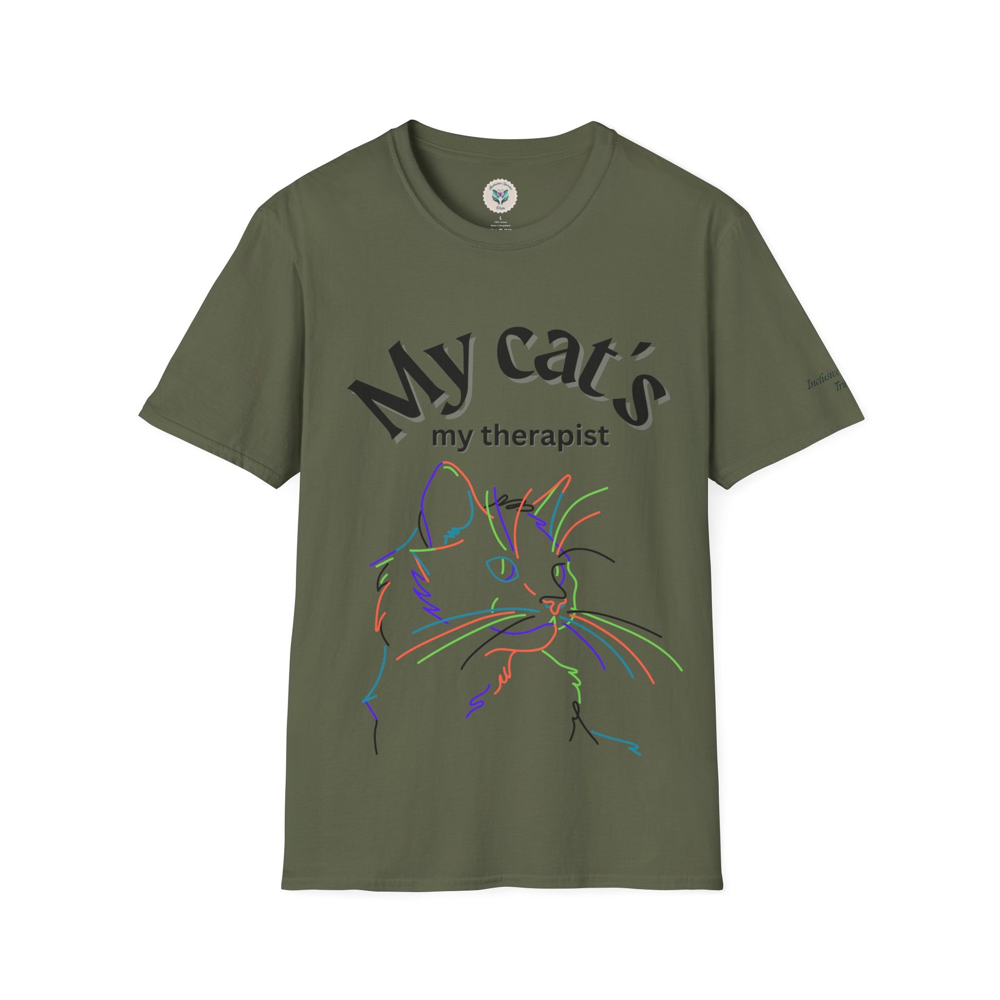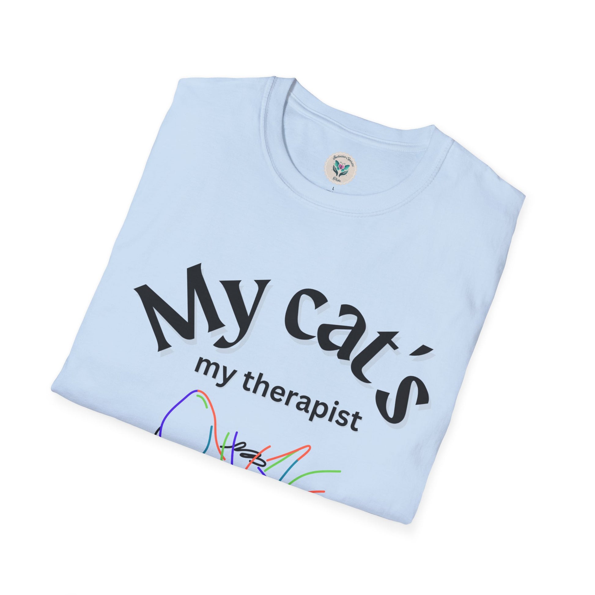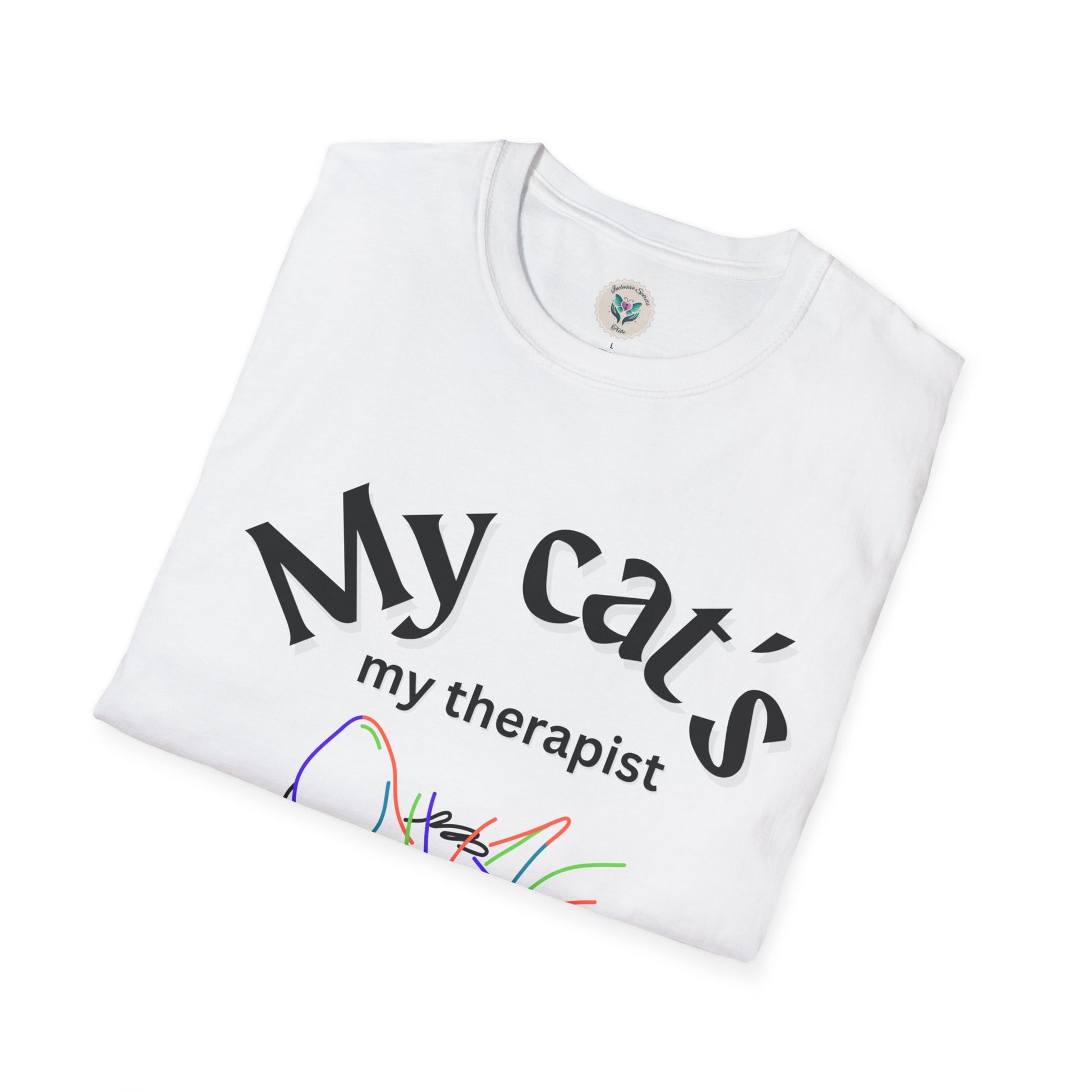Introducing a delightful softstyle t-shirt that embodies the perfect blend of comfort and whimsy. Featuring a charming illustration with the playful phrase ‘My cat’s my therapist,’ this tee is a fantastic addition for cat lovers and anyone who appreciates a sprinkle of humor in their wardrobe. Its lightweight, breathable fabric makes it ideal for year-round wear, ensuring you feel cozy in any season. This versatile piece pairs well with casual jeans or can be dressed up with a stylish jacket for a semi-formal outing.